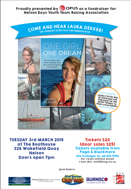 On Tuesday 3rd March, the Nelson Bays Youth Teams Racing Association is hosting Laura Dekker, the world’s youngest ever solo circumnavigator, to give a talk about her experiences and sign copies of her book, next door at The Boathouse. The money raised goes towards providing coaching, running costs, and boat maintenance costs for NBYTRA. There will also be an auction afterwards with loads of great prizes!